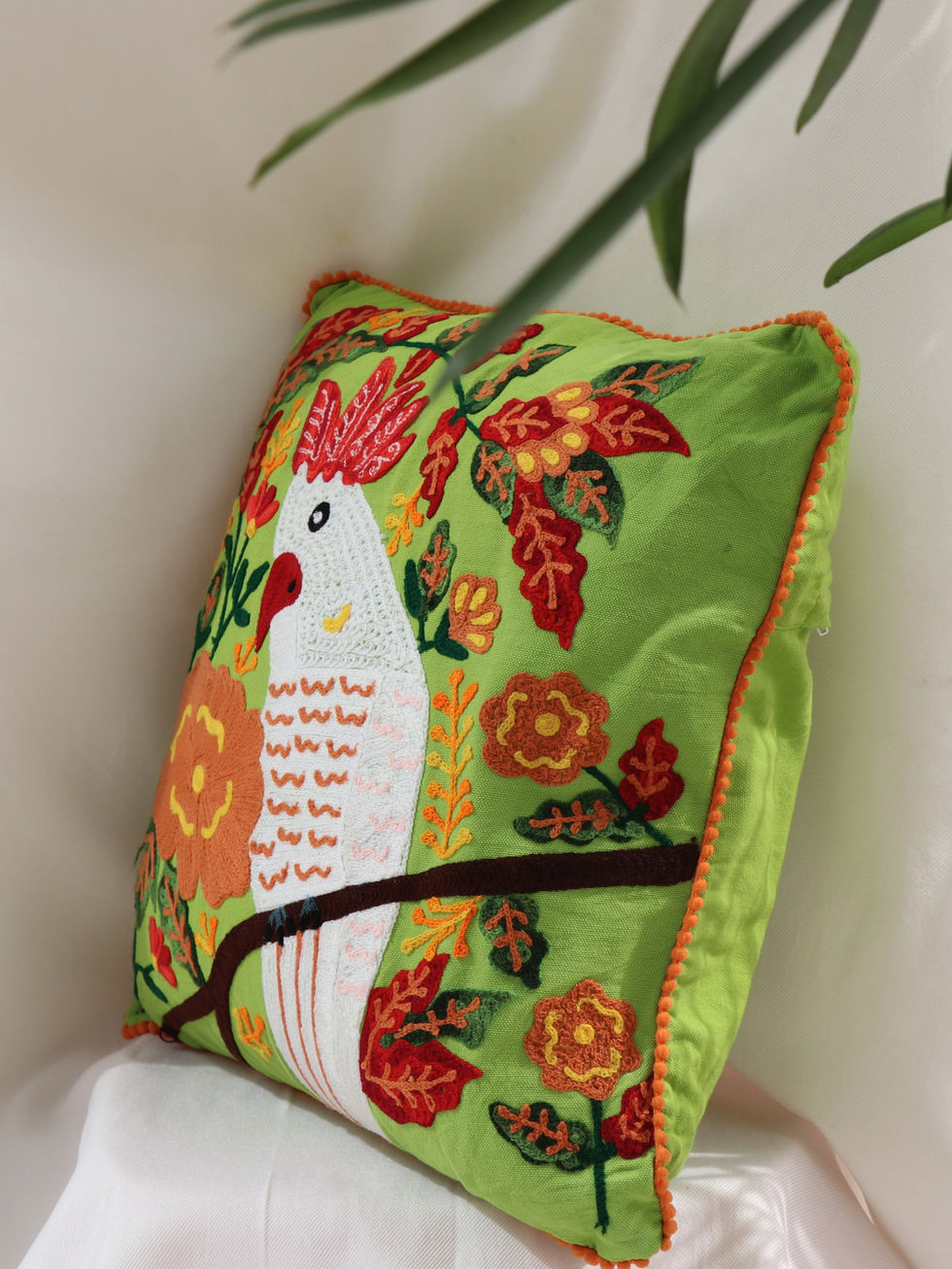 Embroidered Cockatoo Green Cushion cover (16x16 Inch) (40x40 Cm)