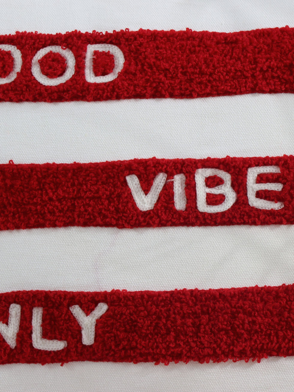 - Colour: Red and white, Design: Striped Good Vibes Only
